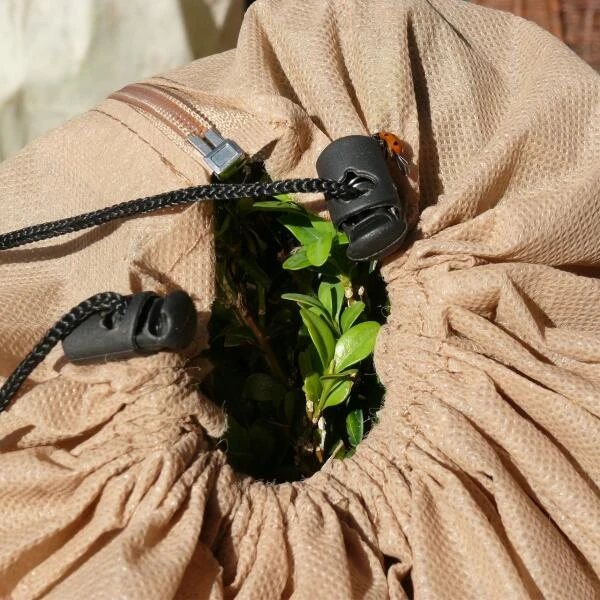 Grote planten met ruime bladkronen bescherm je tegen vorst met deze grote beschermhoes. De vorsthoes is voorzien van een rits waardoor hij makkelijk kan aangebracht worden. Je doet deze hoes eenvoudig rond de plant en maakt deze dicht met de rits. Daarna kun je het geheel netjes afsluiten door het trekkoord bovenaan dicht te snoeren. Onderaan is er eveneens een trekkoord waarmee je hem stevig rond de plantvoet kan aantrekken. Zo zit de hoes als gegoten rond jouw plant en krijgt de wind geen vrij spel.